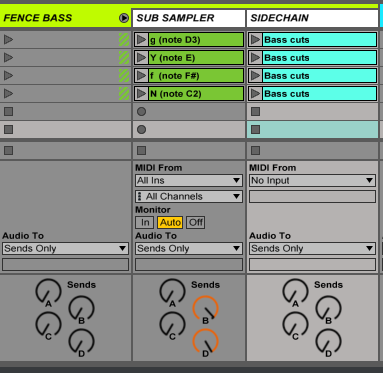 Below is the Fence Bass being routed to sends B & D, which in turn were being sent to outs 2 and 4, the speakers located near the ground.