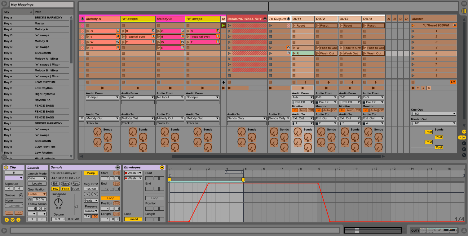 “R” was set up to trigger a simple melodic riff, but if held down for long enough also triggered a ‘resonation FX chain’ that would gradually fade in to make the whole object become awash with a harmonically rich reverb sound. This was accomplished by the triggering of “dummy clips” on the Output channels, which have no audio information, but instead hold automation data. These clips were set up Gate mode, so they would only play when held down.