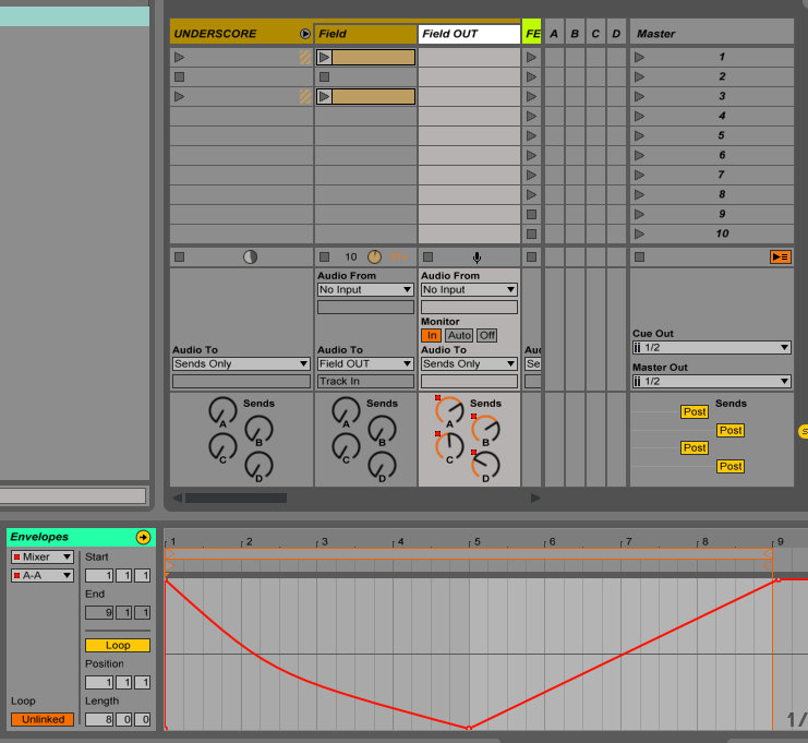 This underscore slowly moved around each of the four speakers through send level automation, once again created within a dummy clip.
