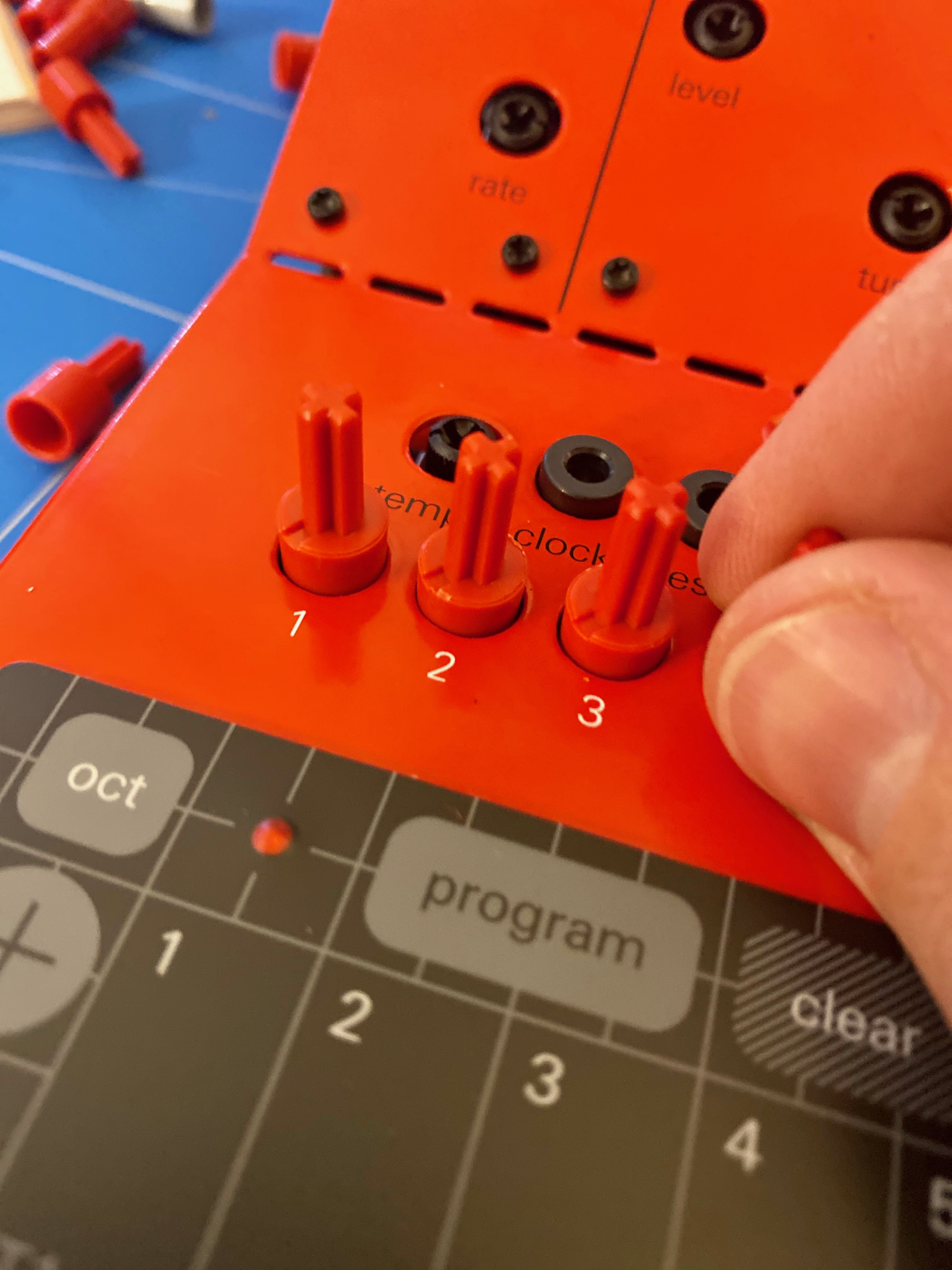 Once everything is in and screwed together, you can start putting in all of the lego-styled knobs. Pay attention here to the small indentations in each and align them to the zero-point of the potentiometer. The small ones in particular are pretty fiddly to get on, so it’s good to get it right the first time.