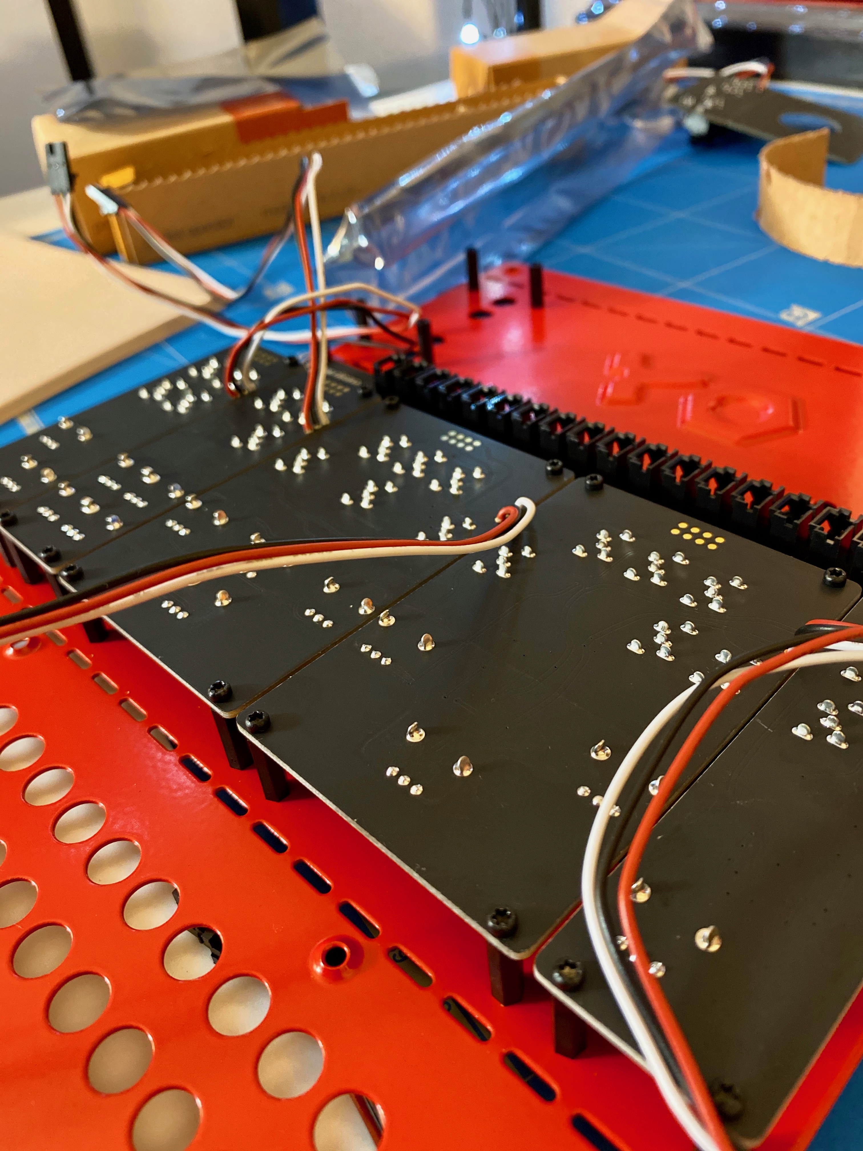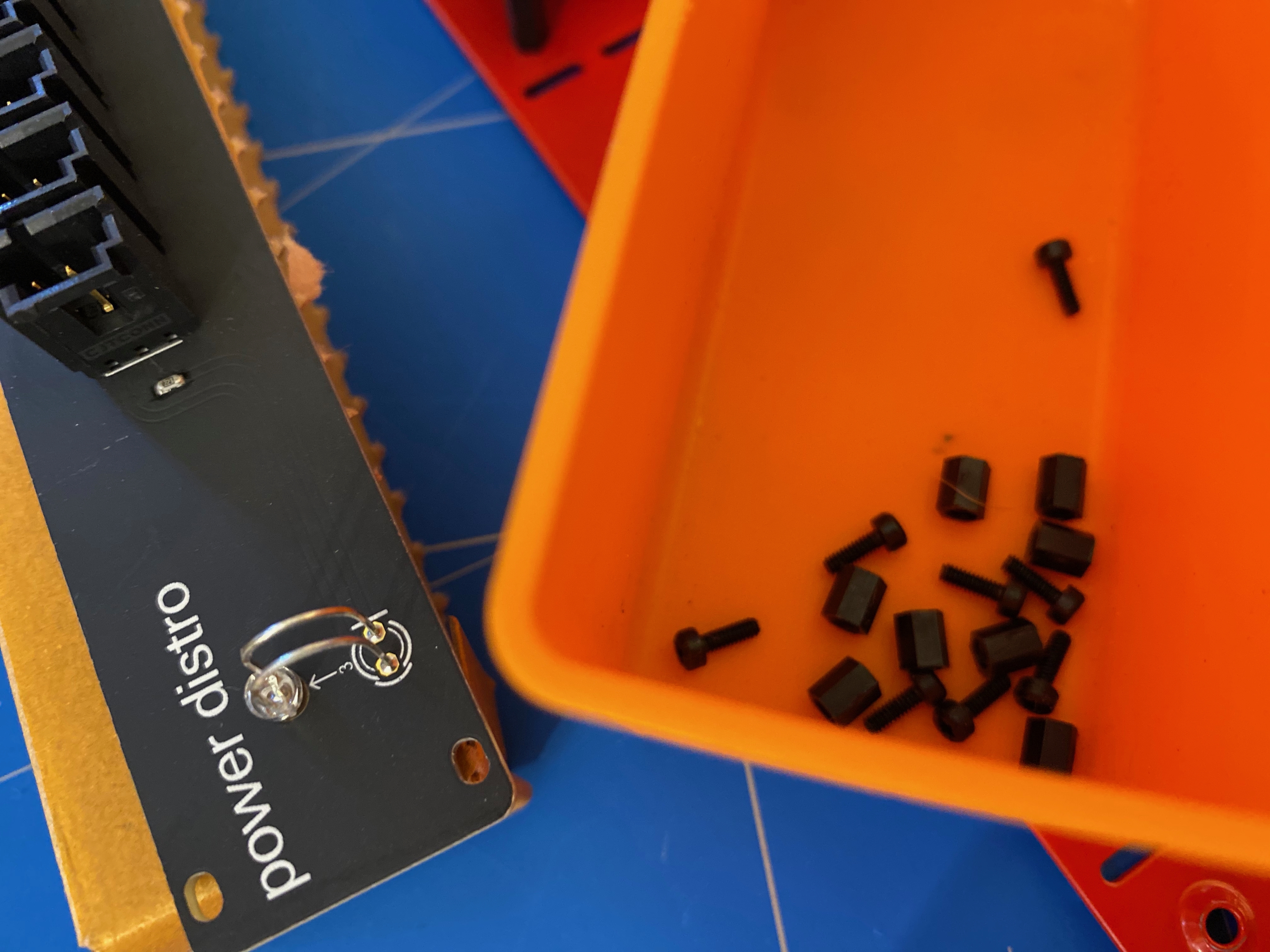 Second piece of advice is to attach the power distro board first. If you put the modules in to start with, you’ll find that some of the power distro screws are difficult to reach, and you really only want to be putting in these screws once, as they have the potential to thread the metal casing if tighten too much, or are screwed in and out too many times.