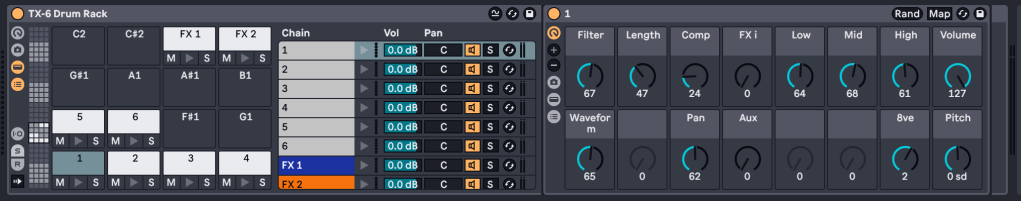 So… I created this drum rack that utilizes the Control Change messages of the TX-6, but within an Ableton Drum Rack. This works pretty nicely with Push also!